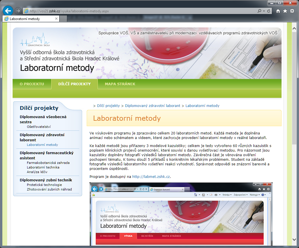Comprehensive e-learning application for the Medical School in Hradec Králové, Department of Nursing Care. This piece of work became very popular and is used by all medical schools in the Czech Republic.